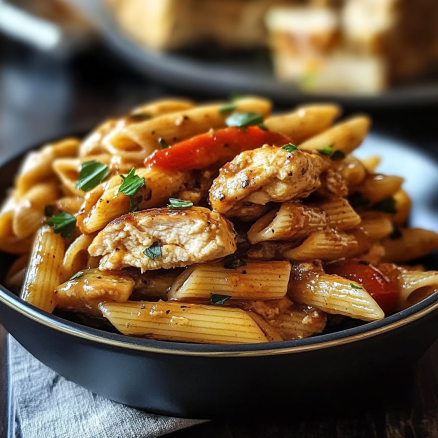 Drain your pasta and toss it into the skillet with the chicken mixture. Mix gently but thoroughly so every noodle gets its fair share of that irresistible sauce.