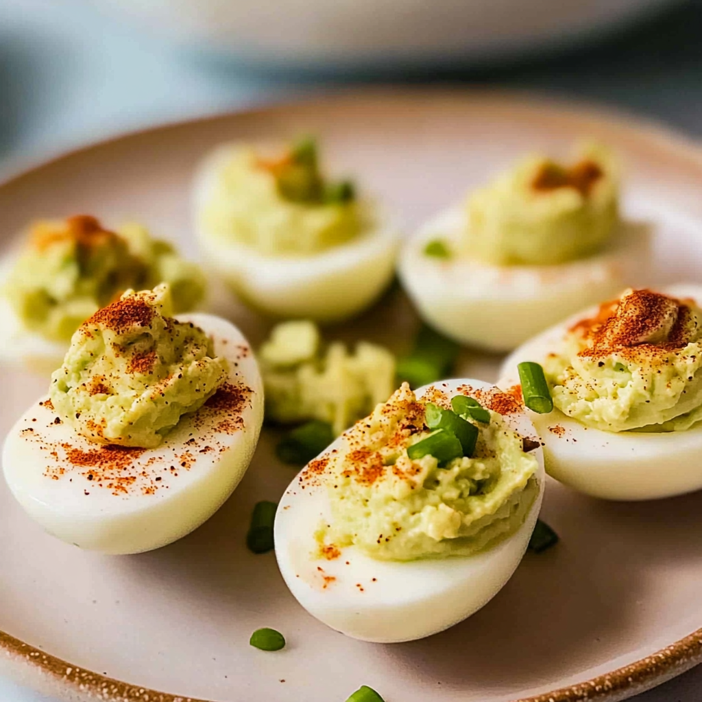 Avocado Deviled Eggs replace mayonnaise with mashed avocado, offering a creamier texture and healthier fat content. The flavor profile shifts as well—avocados lend a rich buttery taste while still providing that classic deviled egg essence.