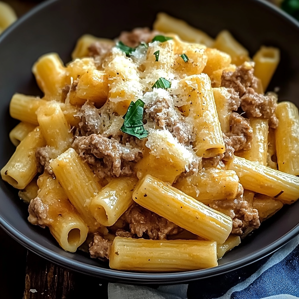 Creamy Parmesan Beef with Rigatoni Pasta is a delightful comfort dish that combines tender ground beef and al dente rigatoni enveloped in a rich, velvety sauce. The aromatic blend of garlic and onion elevates this pasta recipe, making it ideal for cozy family dinners or gatherings with friends. Each bite is a warm embrace on a chilly evening, promising satisfaction and joy.