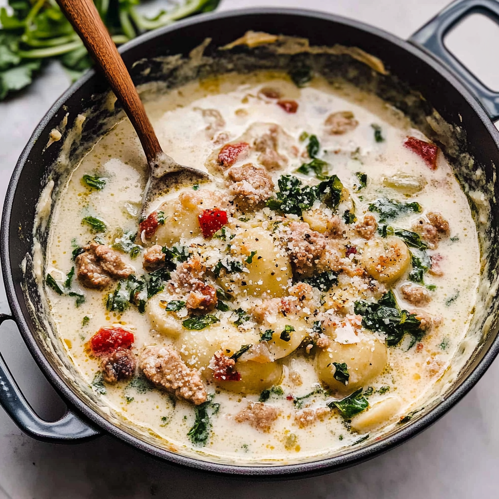 Creamy Zuppa Toscana typically features Italian sausage, kale or spinach, potatoes, onion, garlic, chicken broth, heavy cream, and Parmesan cheese. These ingredients create a hearty soup with various textures that blend beautifully in every spoonful.