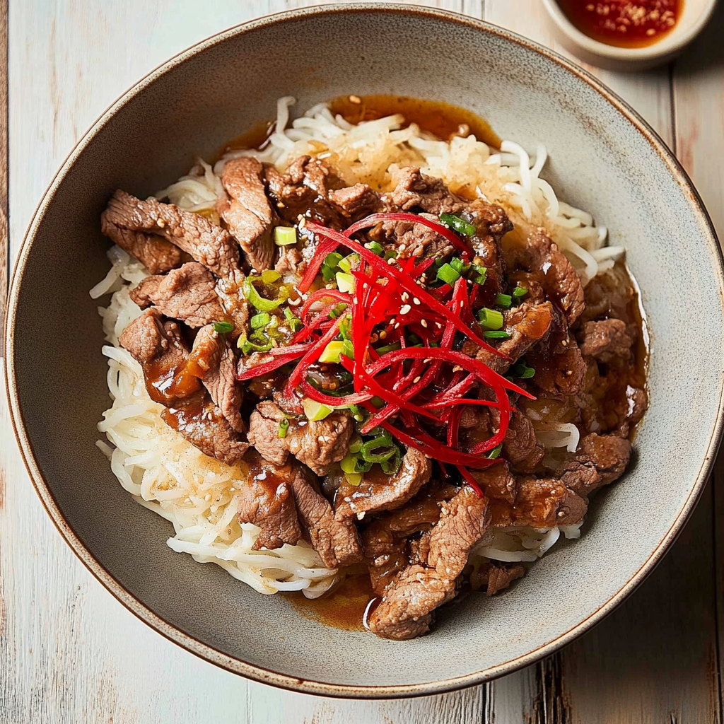 Beef Gyudon is a delicious Japanese rice bowl dish featuring thinly sliced beef cooked in a savory-sweet sauce made from soy sauce, mirin, and sugar. It’s often served over steaming hot rice along with onions and garnished with green onions or pickled ginger.